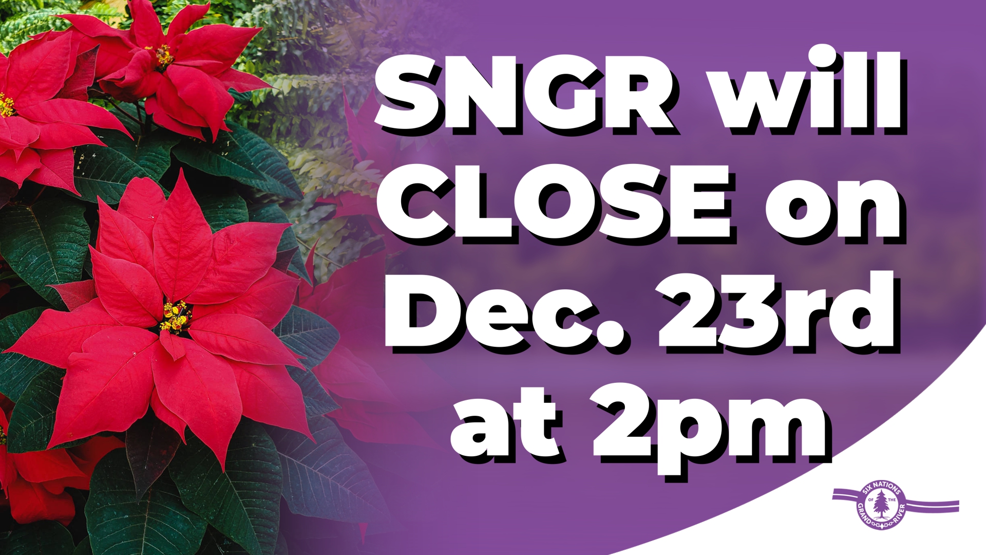 All Six Nations of the Grand River (SNGR) offices will be closing on December 23rd at 2 pm and will be re-opening on January 5th, 2026.